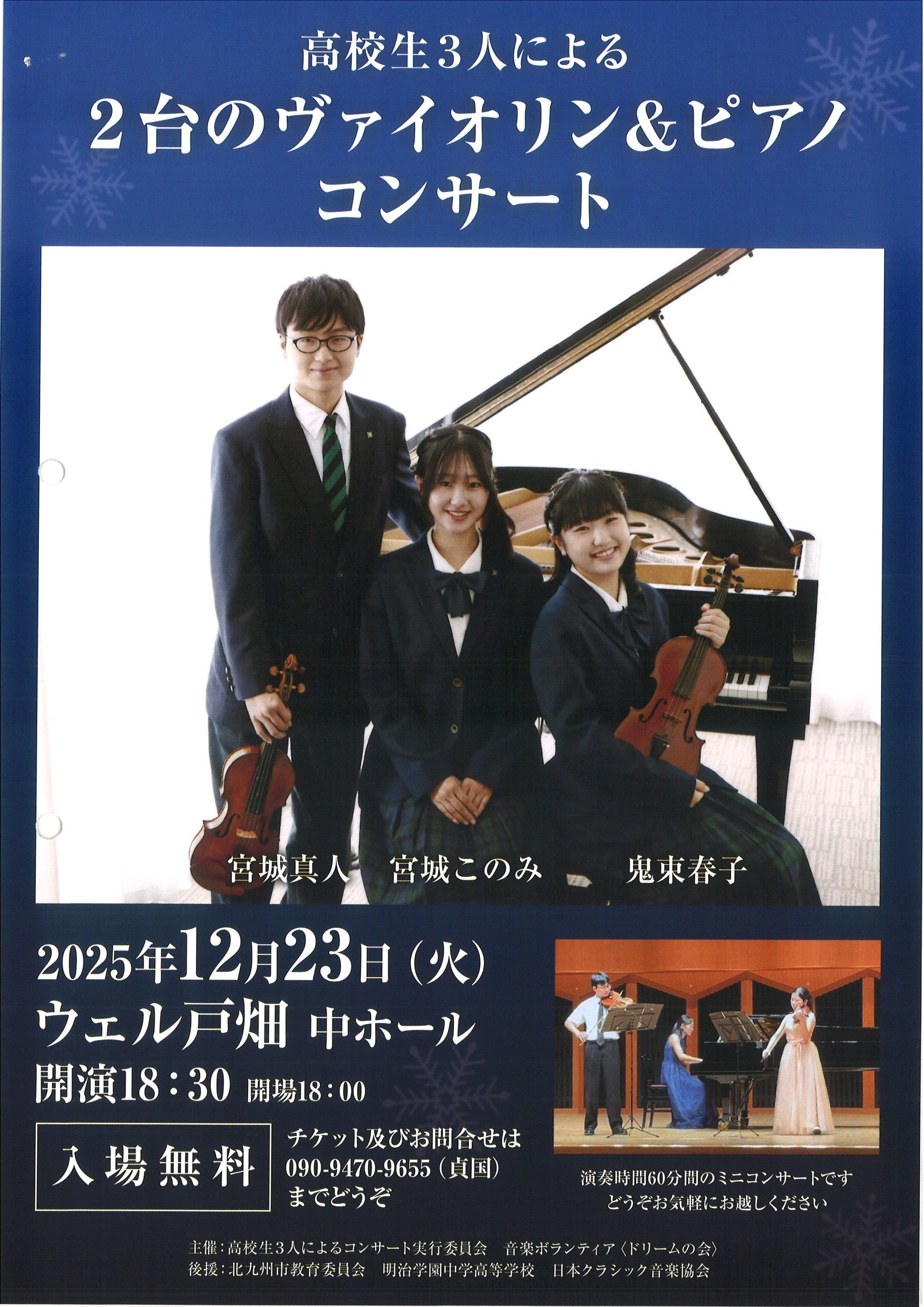 | イベント名 | 高校生3人による2台のバイオリンとピアノコンサート |